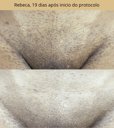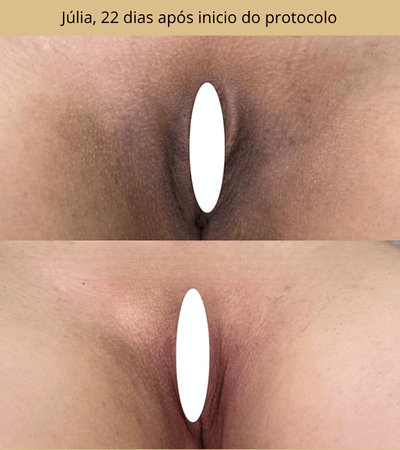 O protocolo foi desenvolvido para uniformizar o tom da pele externa da região íntima e, seguindo o passo a passo, muitas alunas relatam clareamento visível (até 80%) em até 21 dias. Resultados variam de pessoa para pessoa e pedem manutenção. Uso externo, nunca na mucosa.